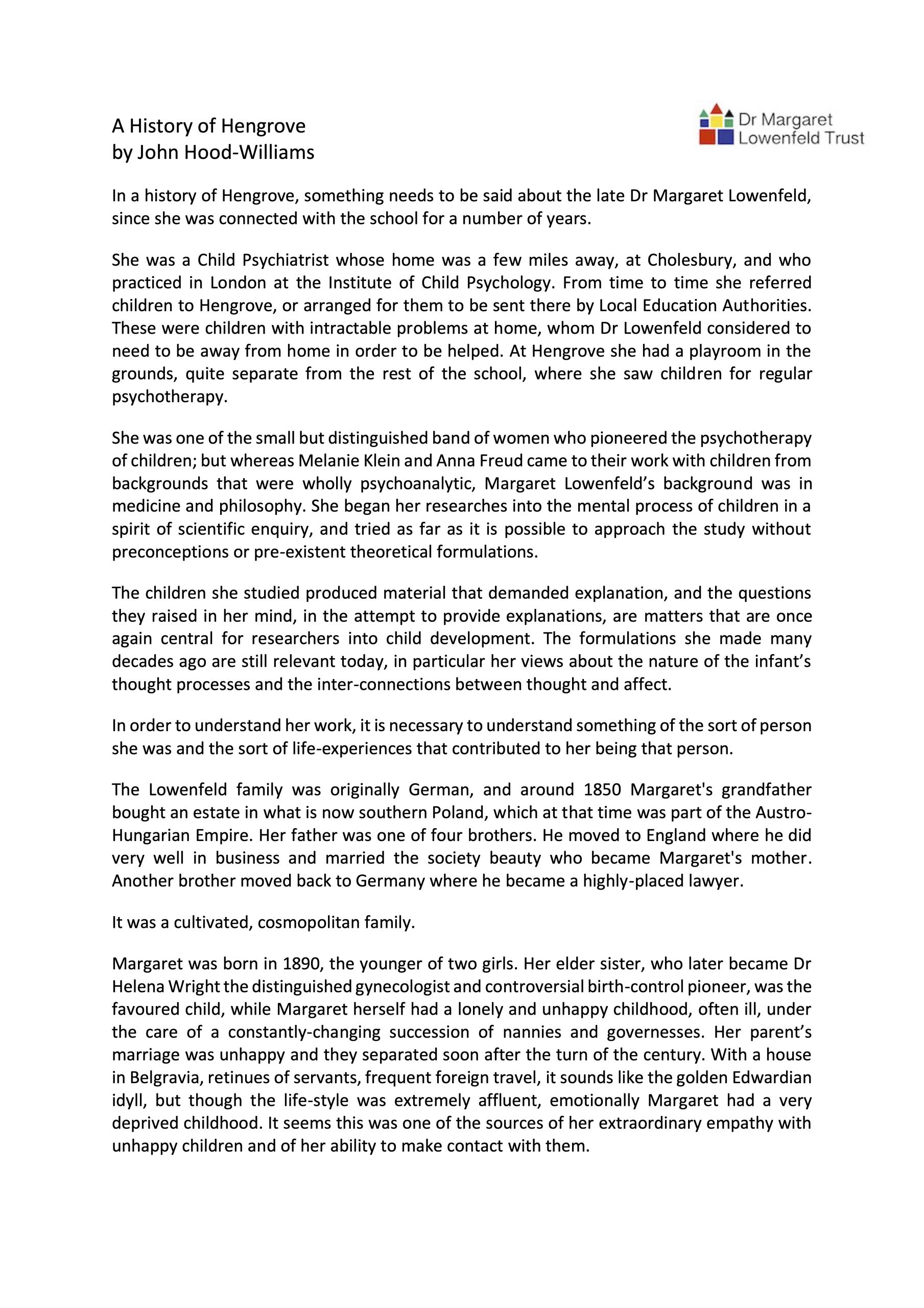 In a history of Hengrove, something needs to be said about the late Dr Margaret Lowenfeld, since she was connected with the school for a number of years.